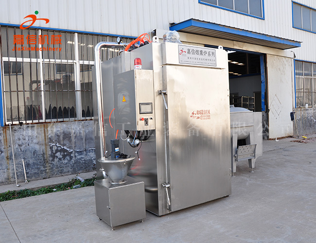 本設備由煙熏箱、自動程(chéng)序控製器、煙霧發生器、煙熏車四部分組成。關鍵(jiàn)部件是由蒸汽管道、熱交換器(qì)和出氣通道組成完善的循環係統,箱(xiāng)內熏煙與熱氣的(de)混合氣體在兩組循環風機的(de)作(zuò)用下,形成渦(wō)流(liú)區域,使混合氣體以適宜的速度平衡而均勻地通過懸掛在(zài)煙(yān)熏箱內(nèi)的肉製(zhì)品,使其熟化和滅菌。